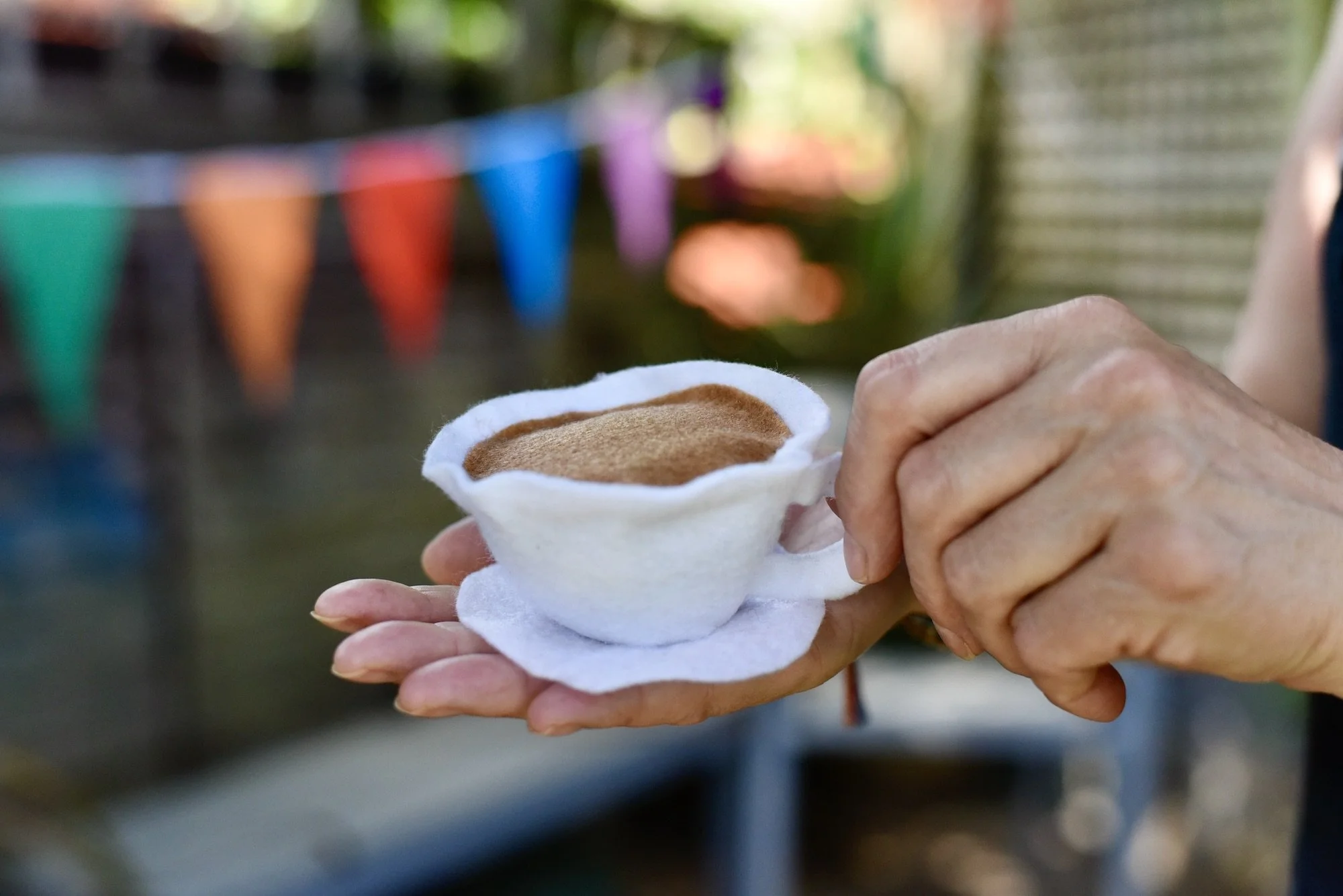 Now take some stuffing and a lavender bag and push it down into the teacup. Take the brown felt circle and place it on top of the stuffing and lavender bag and sew or glue it in place to make the ‘tea’.